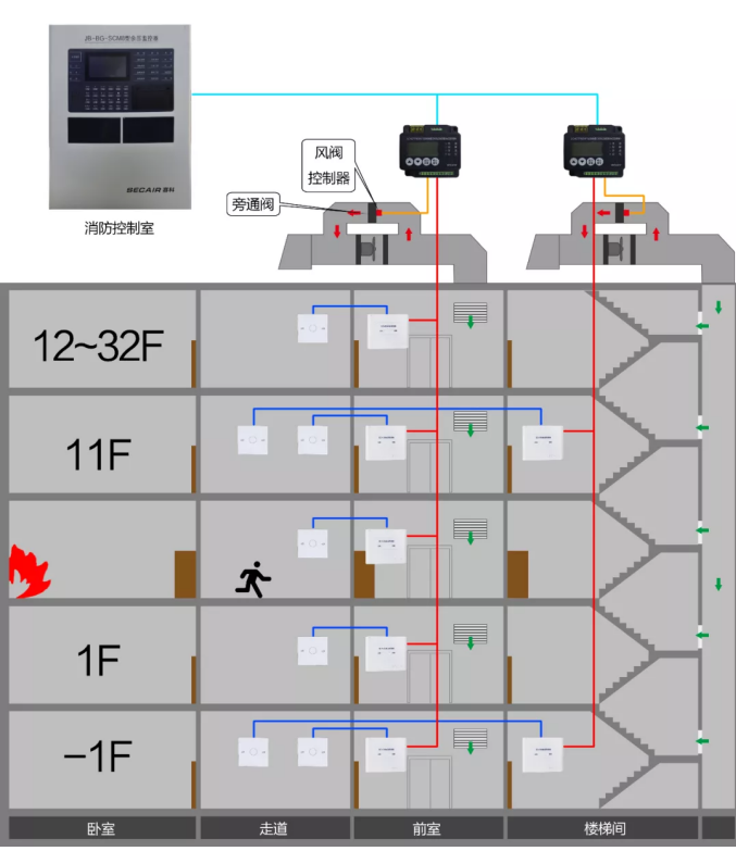 1、對于前室、封閉避難層,由于余壓控制區(qū)域為多個上下不貫通的空間,需要在每層前室設余壓探測器,余壓探測器的探測點設于前室,余壓設定值為25-30pa,當系統(tǒng)控制區(qū)域超壓時,系統(tǒng)聯(lián)動控制泄壓閥執(zhí)行器,根據(jù)實際余壓值與設定值的差異調(diào)節(jié)泄壓閥,以保證前室正壓為設定值。